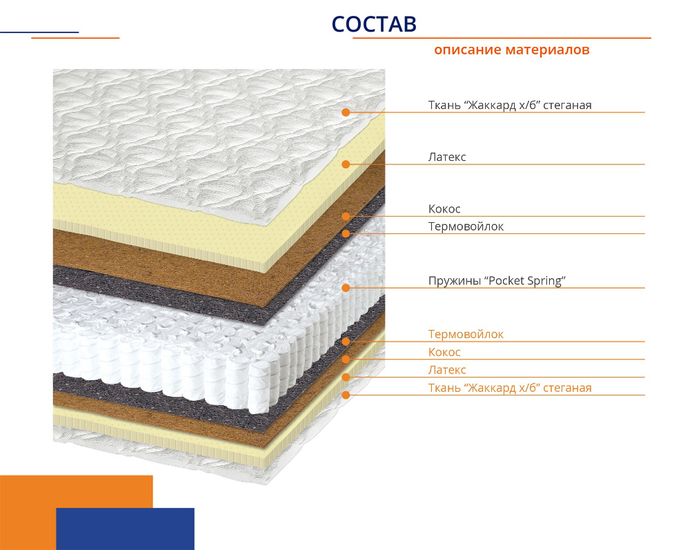 Материалы изготовления матраса: ткань жаккард «Элит», пружинный блок «Multi Pocket Spring», латекс «Эрго», кокосовое волокно, термовойлок.